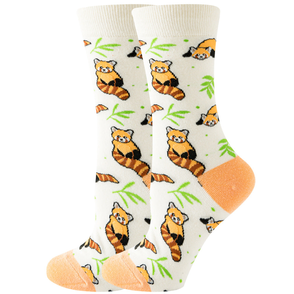 Hvite sokker med lyseoransje detaljer ytterst på sokken og på hælen. Disse sokkene har motiv av flere røde pandaer.