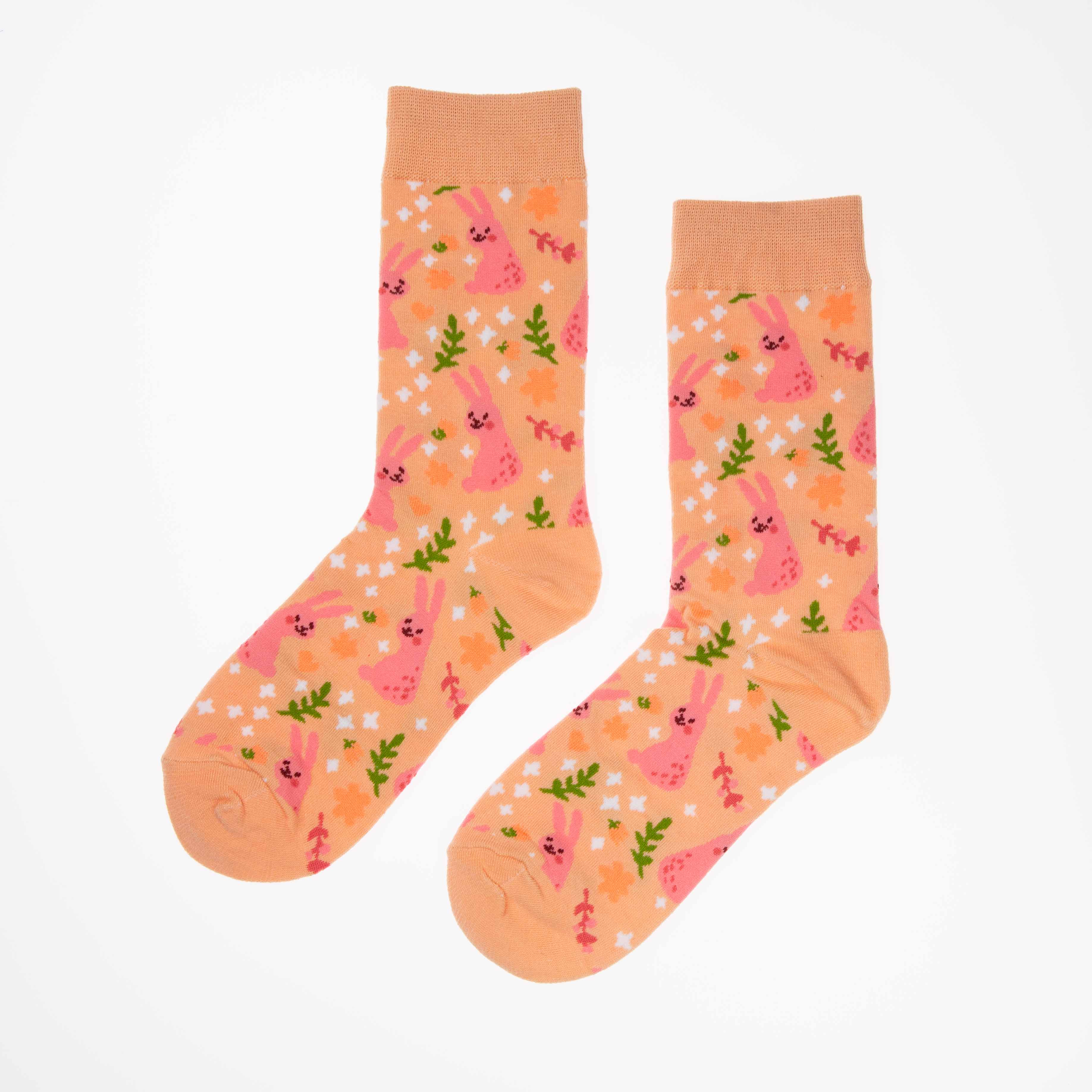 Ferskenfarget sokker med motiv av en kanin. Sokkene er myke og behagelige, og passer til enhver anledning.