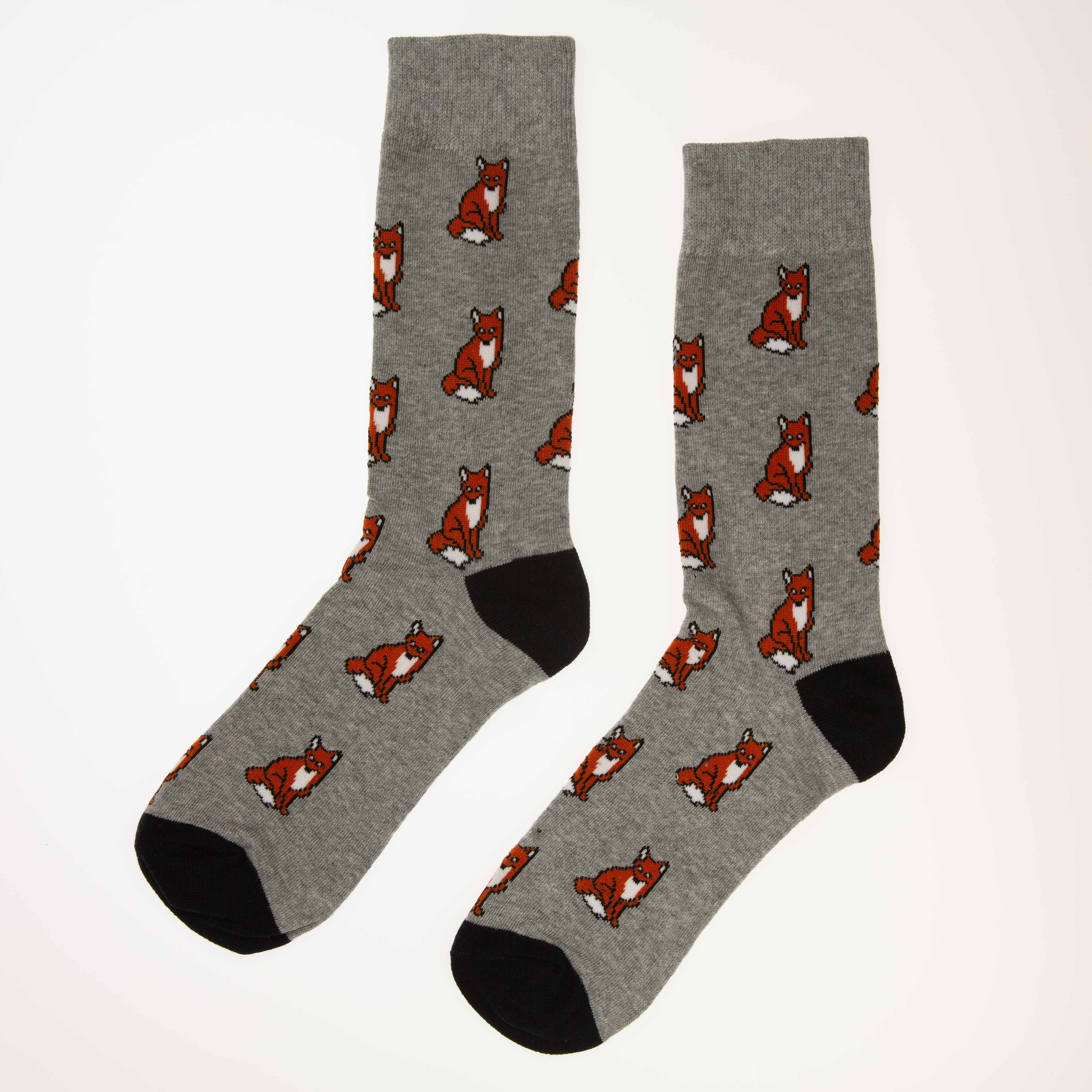 Grå sokker med motiv av en rev. Sokkene er myke og behagelige, og passer til enhver anledning.