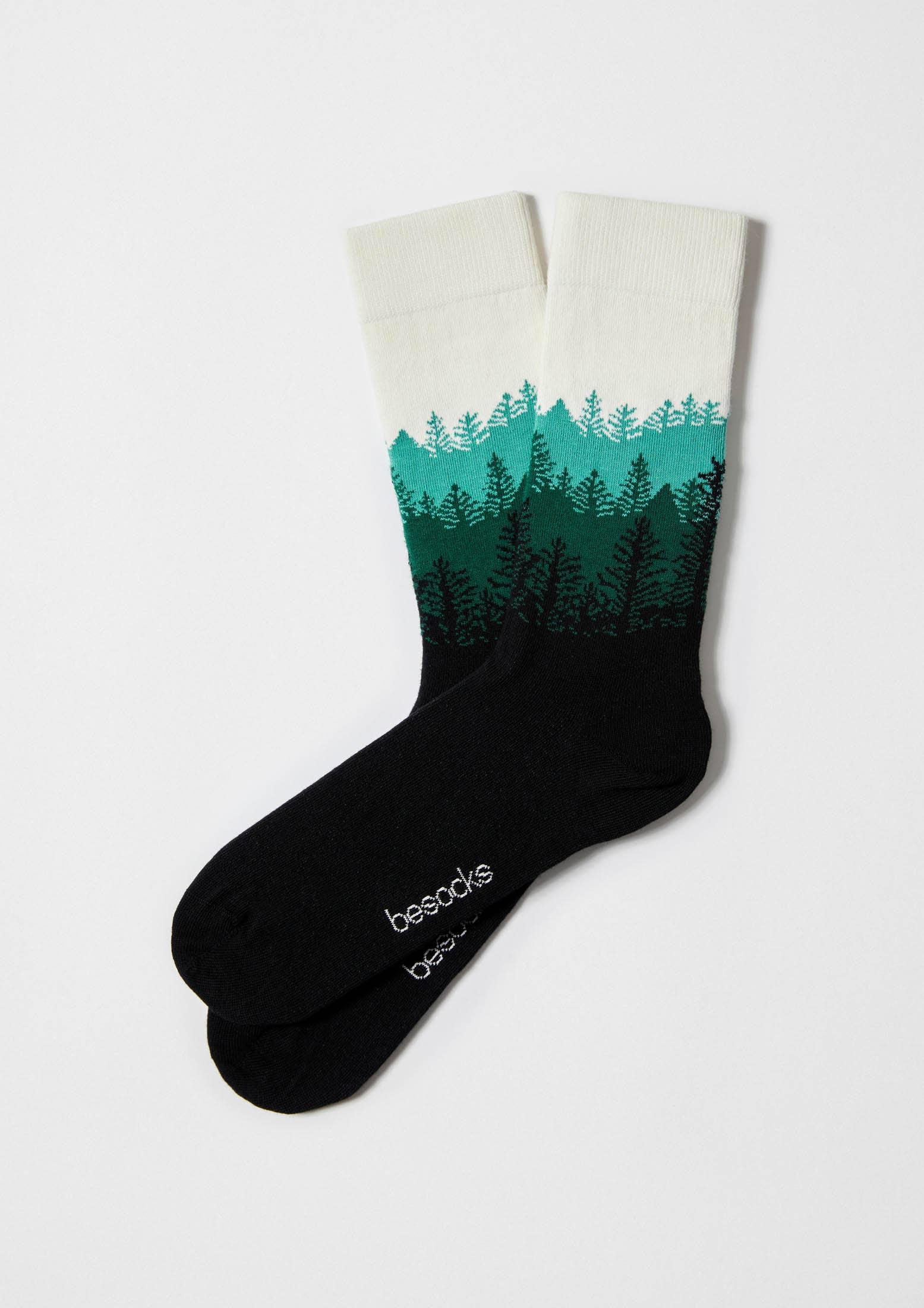Svarte, hvite og grønne bomullssokker med et skogsmotiv fra Besocks. Disse sokkene er laget av myk, pustende organisk bomull som gir perfekt komfort i hverdagen.