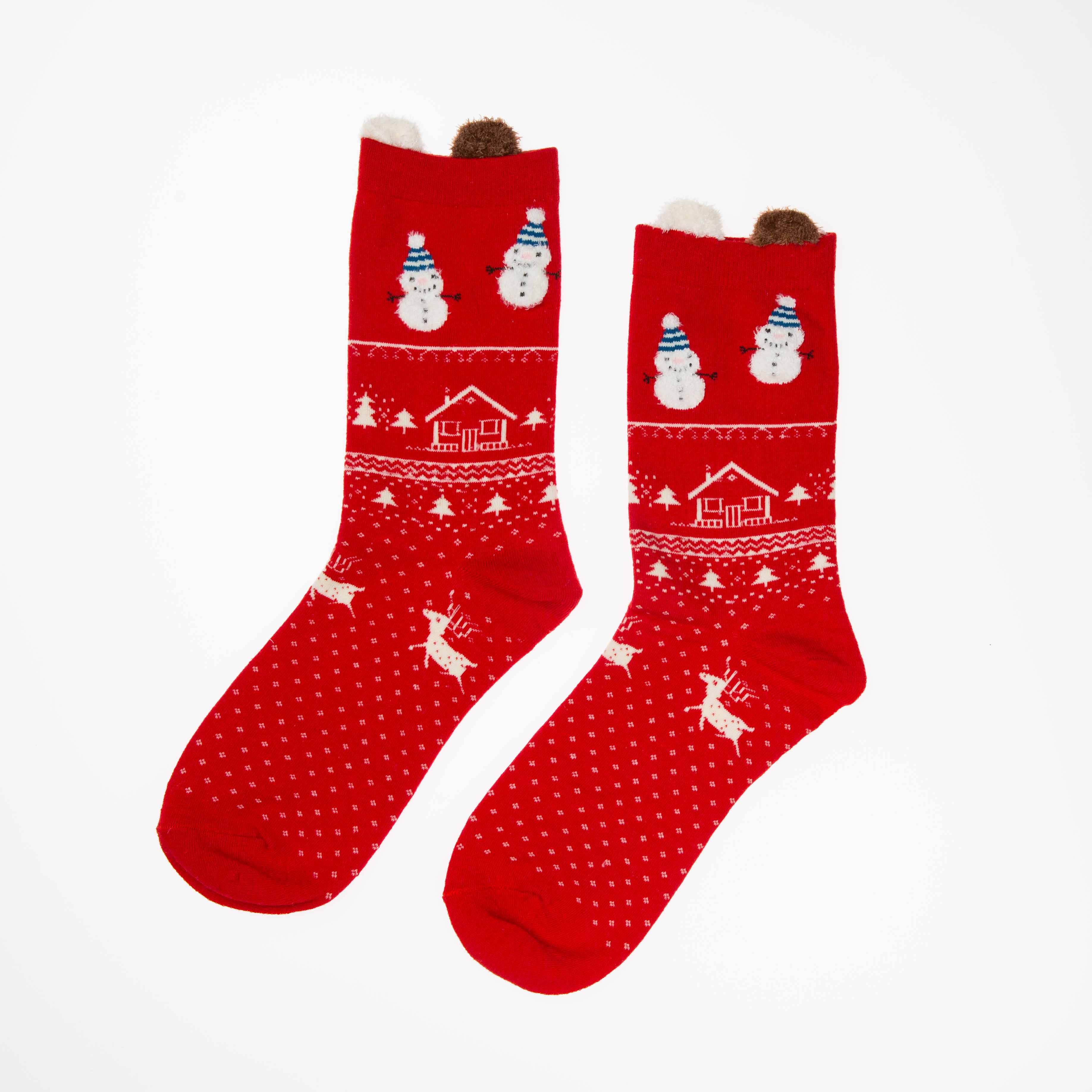 Røde sokker med motiv av snømenn, hus, trær og reinsdyr. Sokkene er myke og behagelige, og passer til enhver anledning.