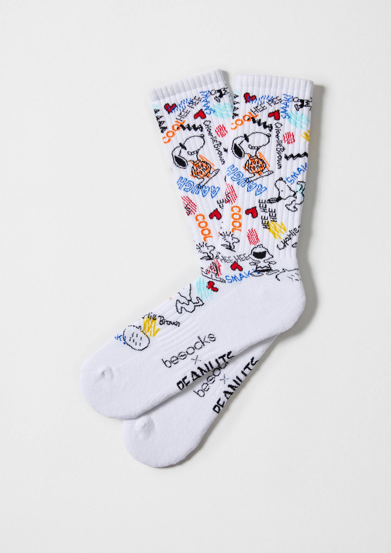 Hvite tennissokker med motiv av Snoopy og fargerik skrift fra Besocks. Disse sokkene er laget av myk, pustende organisk bomull som gir perfekt komfort i hverdagen. Snoopy er en hund med en ustoppelig fantasi, kjent fra tegneserien Knøttene (Peanuts). Med disse nostalgiske sokkene kan vi garantere at gamle, gode barndomsminner blir vekket til live!