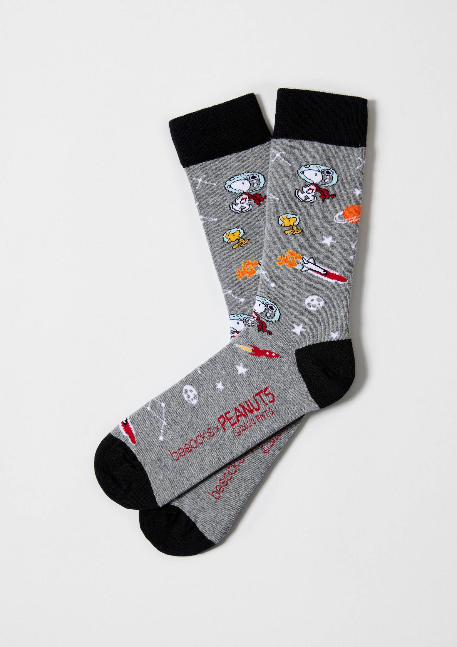 Grå bomullssokker med motiv av Snoopy i verdensrommet fra Besocks. Sokkene har svarte detaljer ytterst på sokken, hælen og øverst på kanten av sokkene. Disse sokkene er laget av myk, pustende organisk bomull som gir perfekt komfort i hverdagen. Snoopy er en hund med en ustoppelig fantasi, kjent fra tegneserien Knøttene (Peanuts). Med disse nostalgiske sokkene kan vi garantere at gamle, gode barndomsminner blir vekket til live!