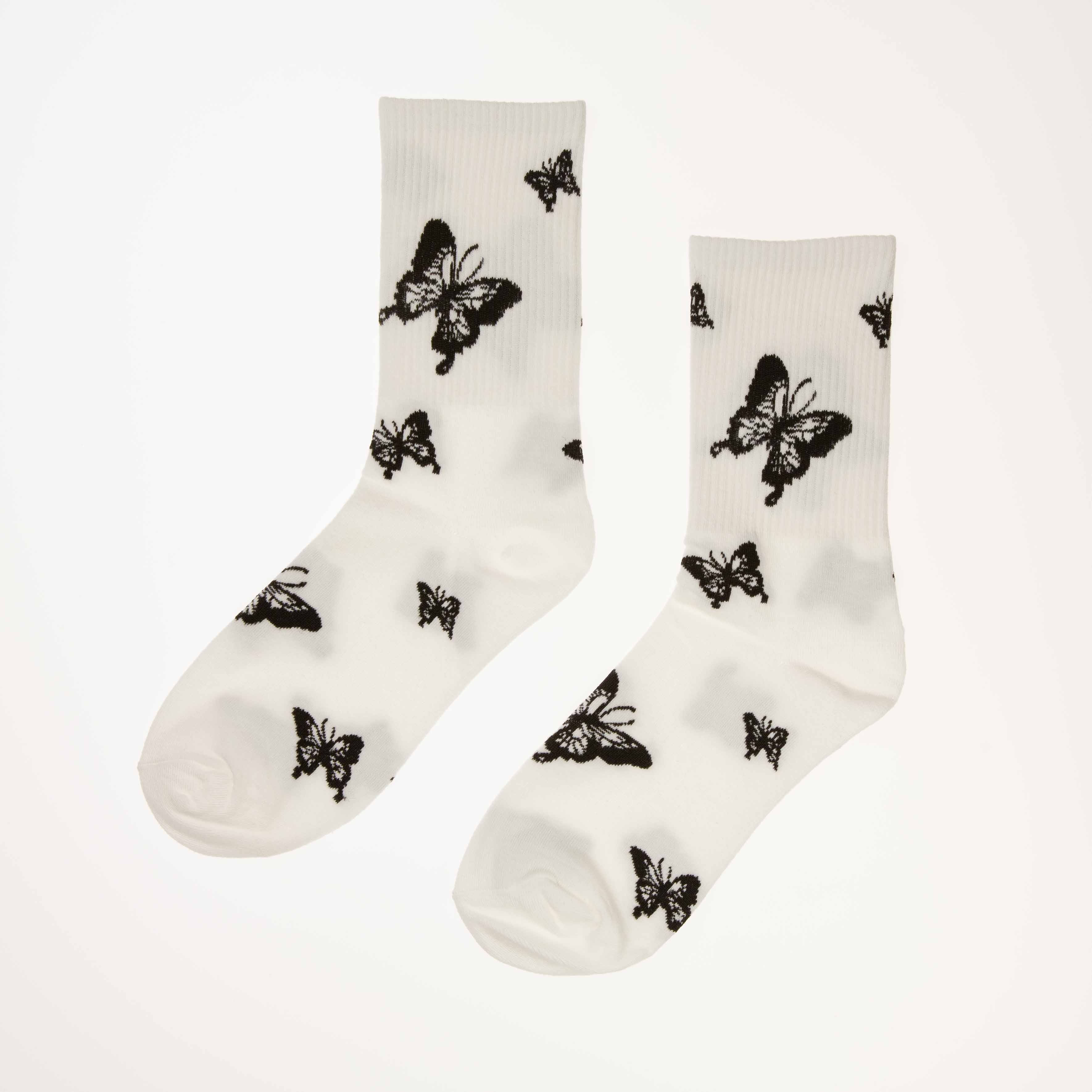 Hvite sokker med motiv av sommerfugl. Sokkene er myke og behagelige, og passer til enhver anledning.