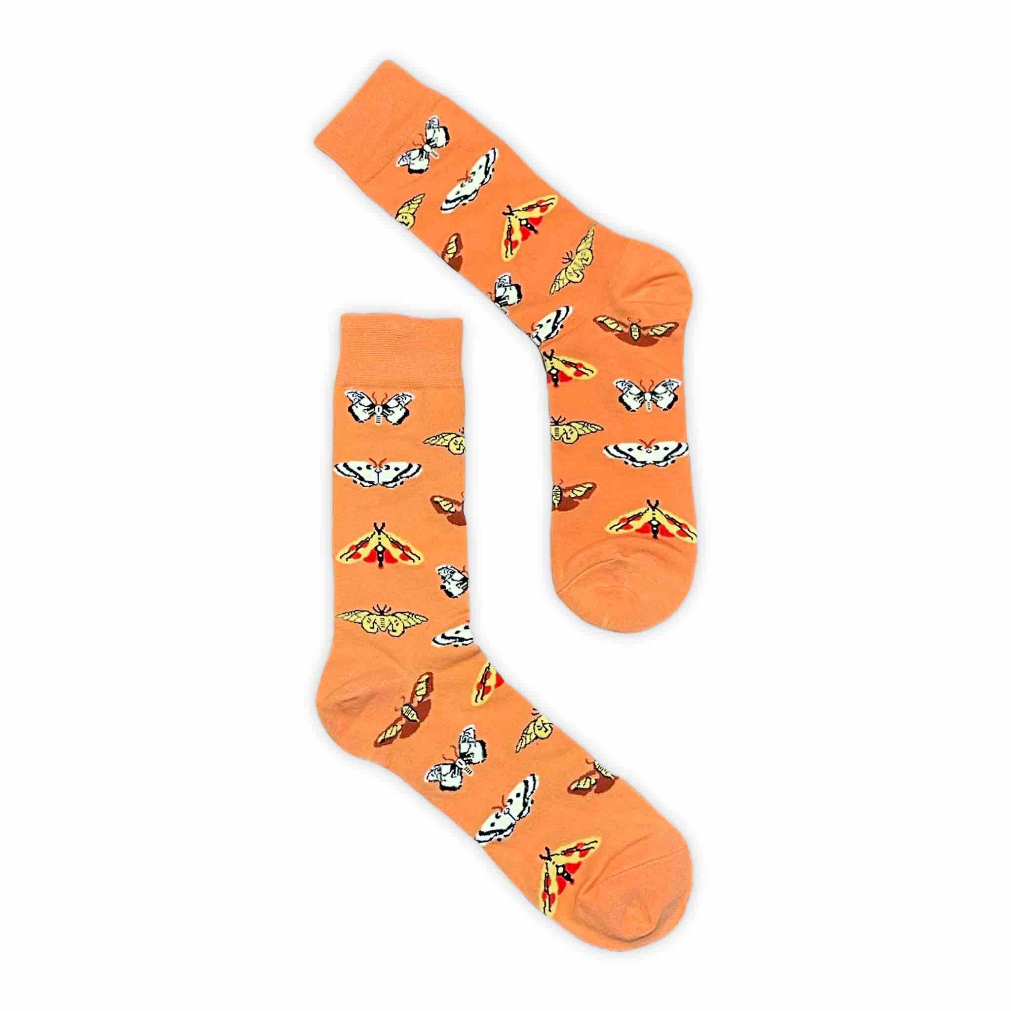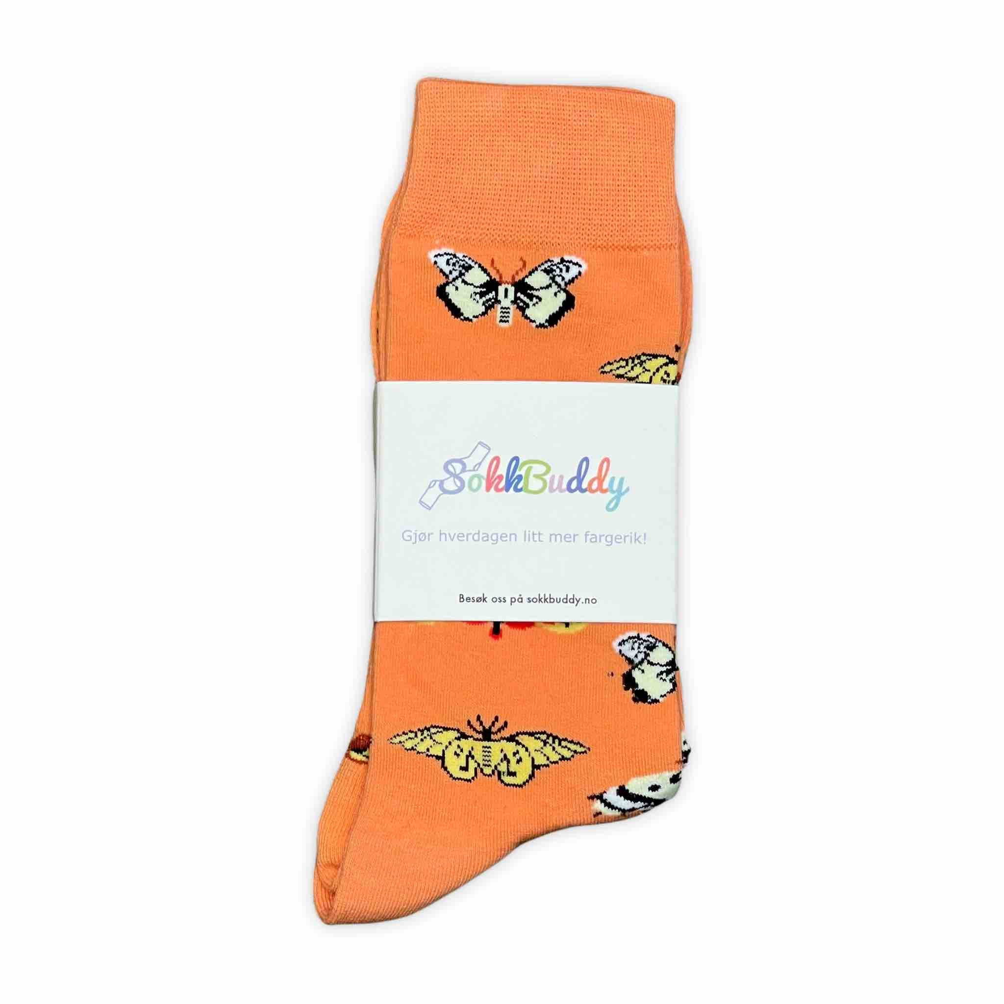 Oransje sokker med motiv av sommerfugler.