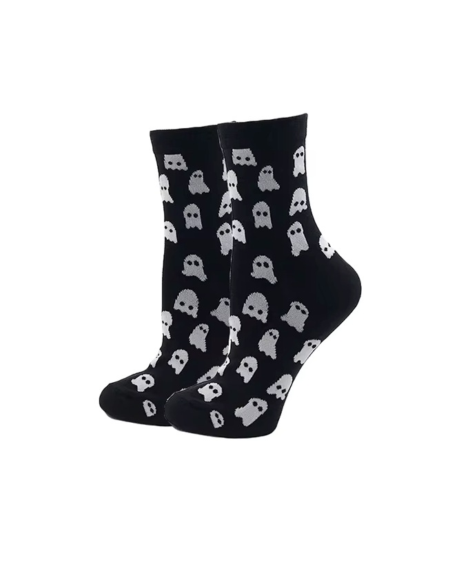 Svarte sokker med motiv av spøkelser. Sokkene er myke og behagelige, og passer til enhver anledning.