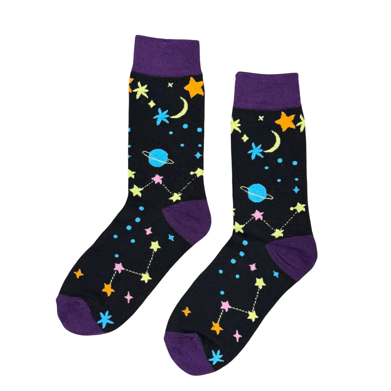 Ta et steg ut i verdensrommet med disse magiske sokkene fulle av stjerner, planeter og kosmiske detaljer! Den svarte bakgrunnen gir et himmelsk preg, mens de lilla kantene setter prikken over i-en. Perfekt for deg som elsker stjernehimmelen og alt som er litt utenomjordisk! ✨🚀🌙