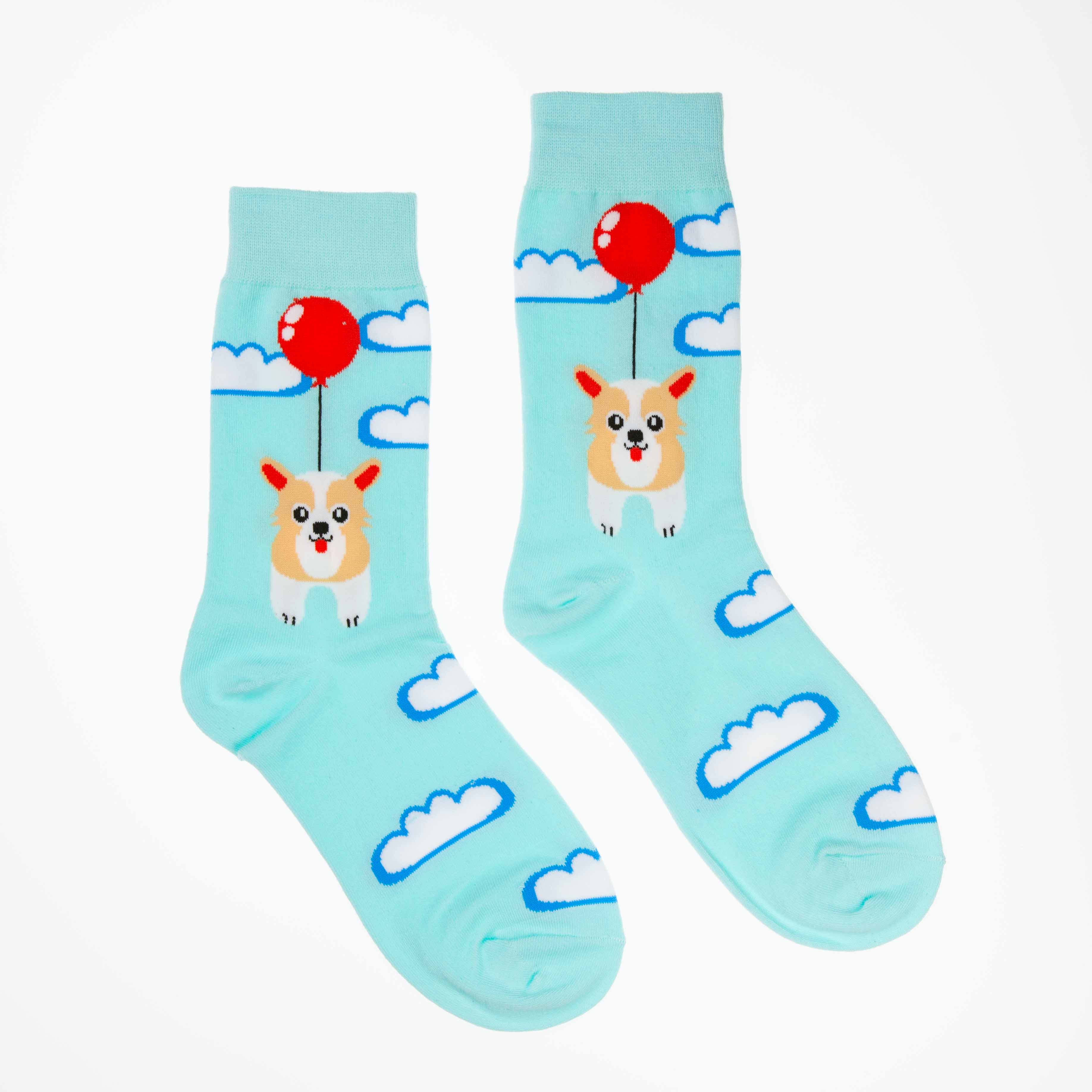Lyseblå sokker med motiv av en corgi som svever i en ballong. Sokkene er myke og behagelige, og passer til enhver anledning.