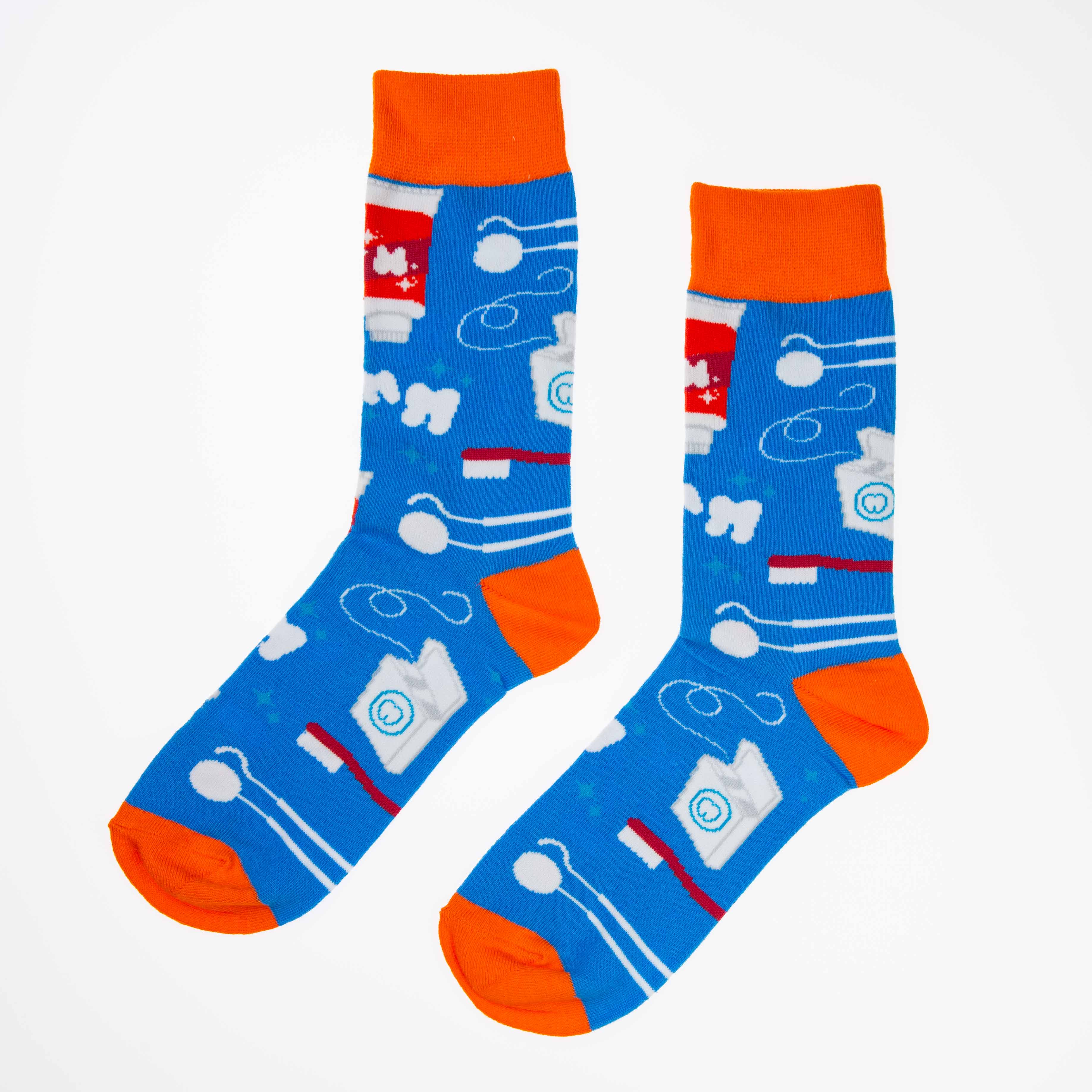 Blå og oransje sokker med motiv av tenner, tannbørste og tannkrem. Sokkene er myke og behagelige og passer til enhver anledning.