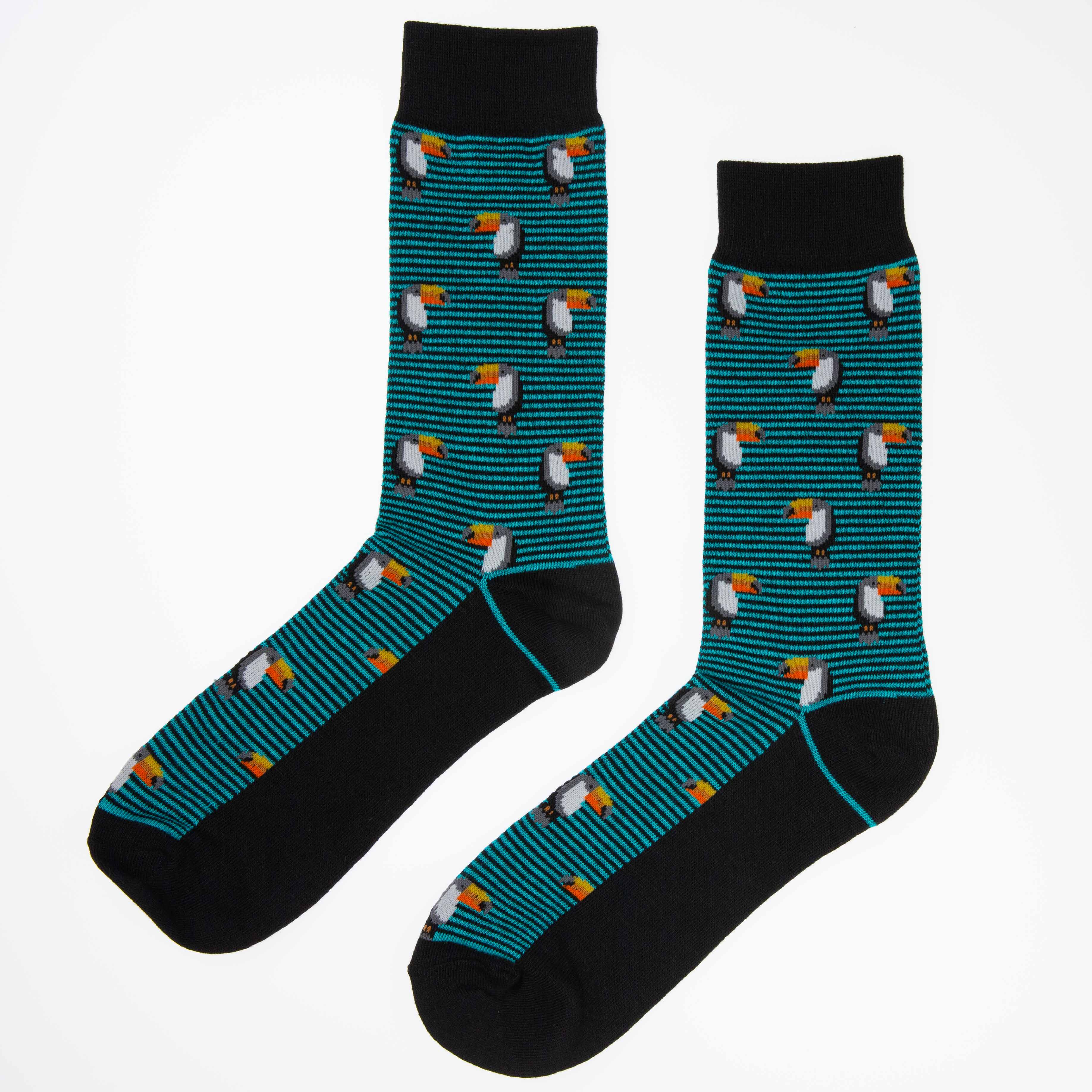 Turkise og svarte sokker med motiv av tukan. Sokkene er myke og behagelige, og passer til enhver anledning.