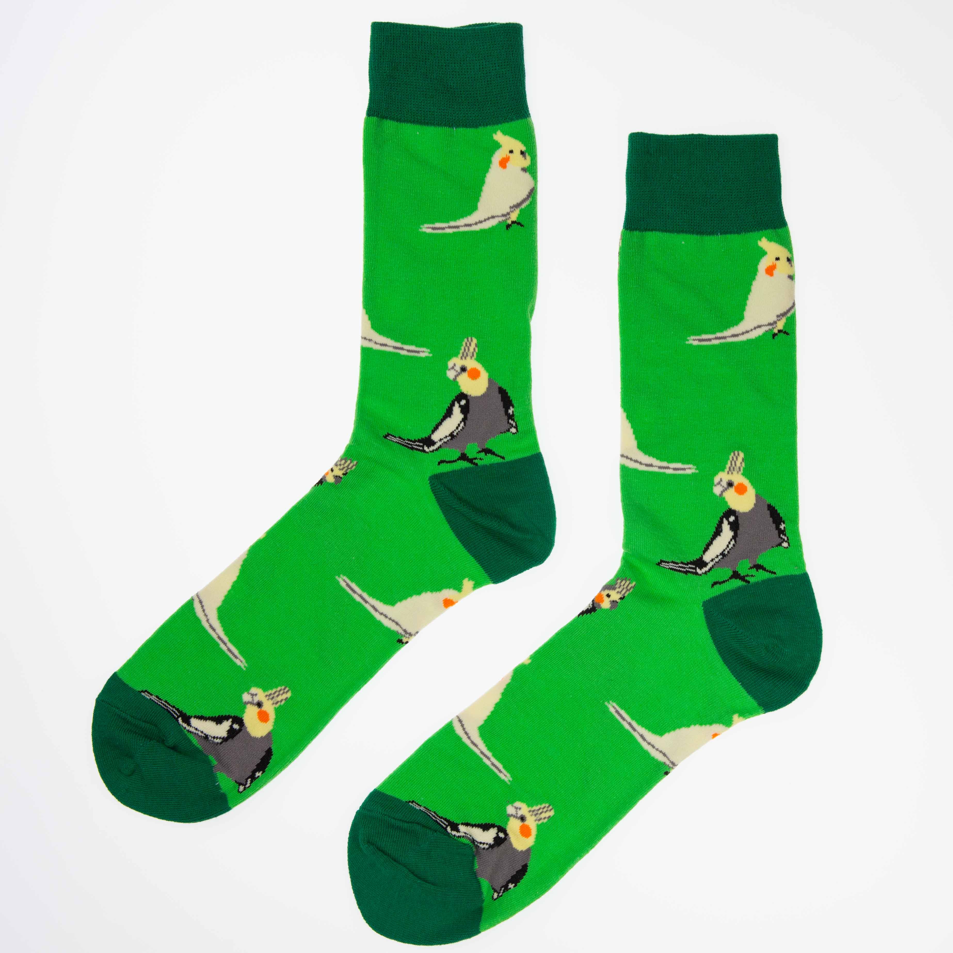 Grønne sokker med motiv av undulater. Sokkene er myke og behagelige, og passer til enhver anledning.