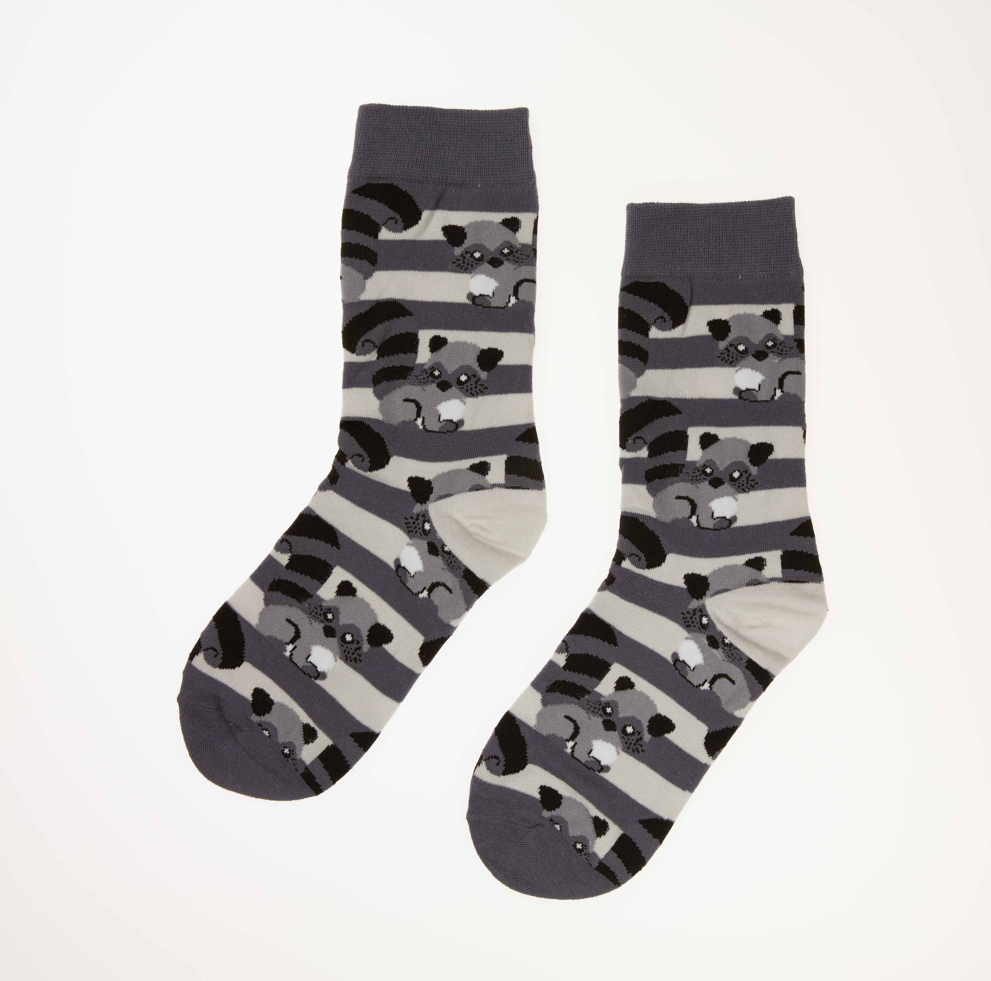 Grå sokker med motiv av en vaskebjørn. Sokkene er myke og behagelige, og passer til enhver anledning.